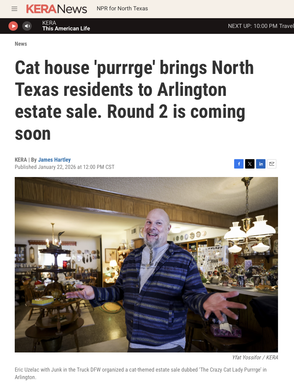 Our most recent estate sale, the Crazy Cat Lady Purrrge was featured on KERA News. This unique in-person estate sale, featuring thousands of kitten figurines, was the cat’s pajamas! Read a little bit about our story and why this sale was particularly meaningful.